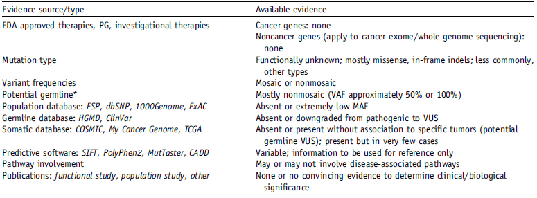 肿瘤特异性数据库给予汇总之后的不同肿瘤类型及亚型间的序列变异发生率,还包括发表的文献、临床试验、成果数据等数据,见表1 Cancer-specific variant databases。