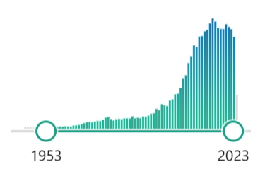从1953年到2023年,相关文献数量持续增长并在2023年达到一个高峰,这反映了近70年来,在精神分裂症的遗传学研究领域,科研工作和相关认知的大量积累。该图像直观地展示了这一领域研究热度与成果的变化历程。